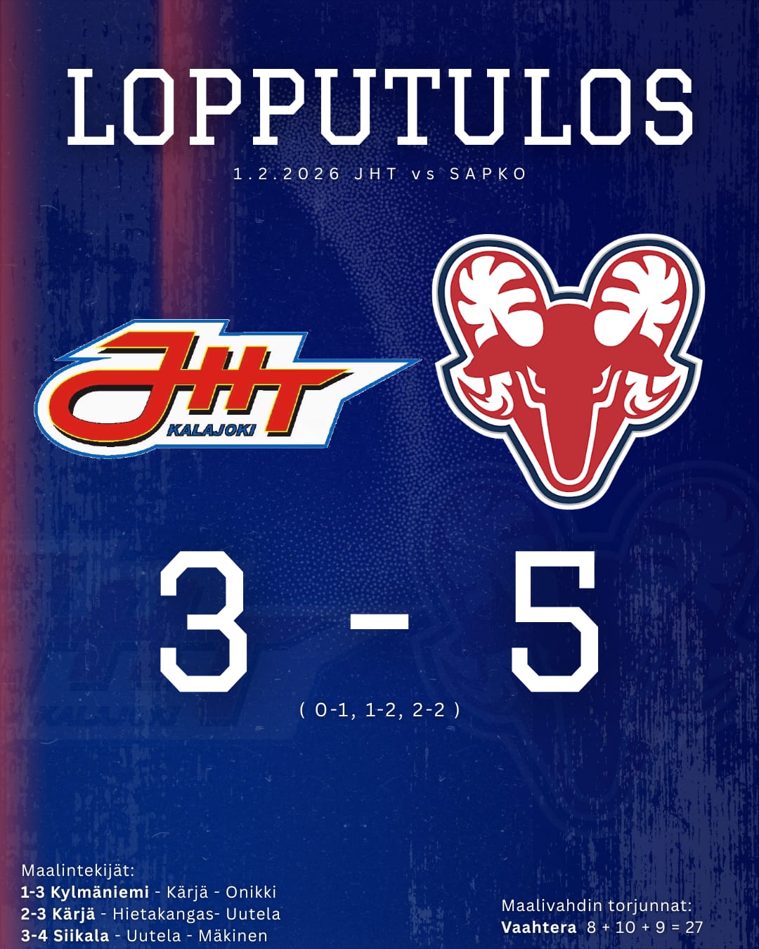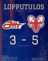 Kolmanteen erään JHT lyö vielä kaikki peliin ja nouseekin heti maalinpäähän ottelunparhaana palkitun Veikkä Kärjän ylivoimaosumalla. Tasoitusosuman hakeminen kokee kuitenkin kolauksen ennen erän puoltaväliä, kun Sapkon vahva ykkösnyrkki karkaa vankistamaan johdon jälleen kahteen maaliin. Junkkarimiesten taistelutahto palkitaan vielä viisi minuuttia ennen päätös summeria. Hermes laina Valtteri Siikala ohjaa Miko Uutelan ja Samuel Mäkisen alustuksen längistä sisään. Näin saadaan ottelun loppuun vielä täysi trilleri, kun JHT hakee tasoitusmaalia kuuden kenttäpelaajanvoimin ilman maalivahtia. Uhkapeli ei tuota tällä kertaa haluttua tulosta, kun kiekonmenetyksen seurauksena ex-JHT hyökkääjä Konsta Piirainen karkaa lyömään loppunumerot tauluun. JHT maalissa pelannut Fredrik Vaahtera venyi Sapko vyörytyksessä kiekon eteen 27 kertaa, kun virkaveli Eetu Uotinen torjui JHT lähentelyt 35 kertaa.