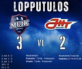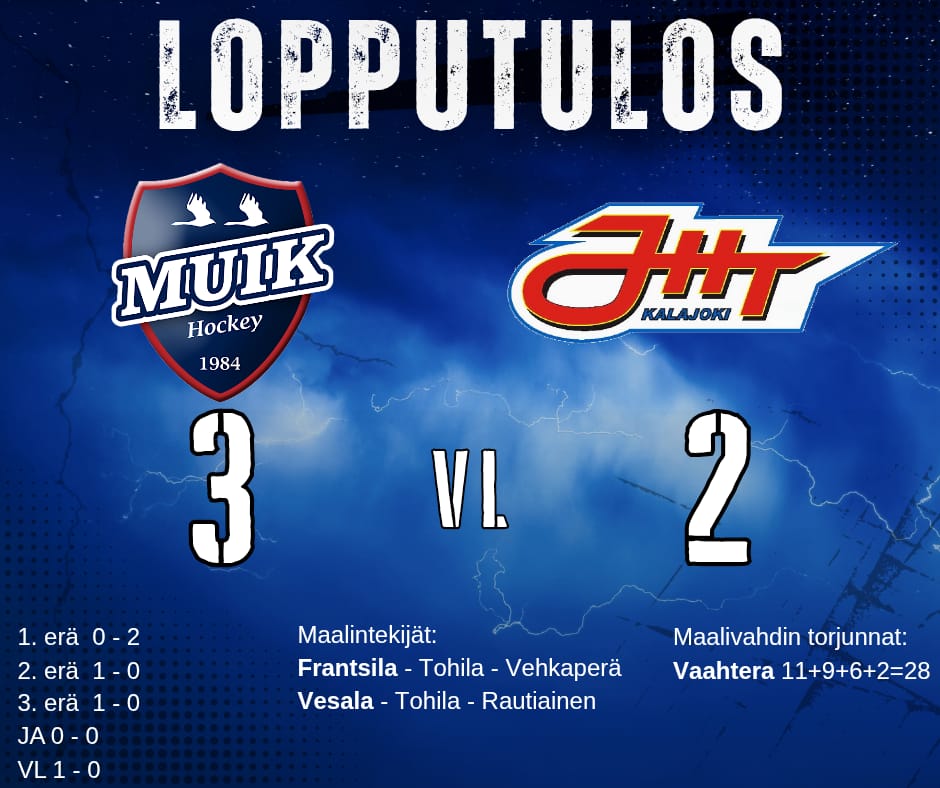 JHT lähti perjantaina Komarov areenalle ennakkoluulottomasti katkaisemaan kolmen ottelun mittaiseksi venähtänyttä tappioputkeaan. Sarjan kärjessä keikkuva kotijoukkue Muik Hockey vain piti pintansa, nousten kolmannessa erässä tasoihin ja lopulta voittoon voittolaukauskisan jälkeen. Todella vauhdikkaassa ja tarkassa puolustuskamppailussa, JHT ottaa kotijoukkueelta luulot pois runnomalla kaksi maalia avauserään. Molempien maalien pääarkkitehtina häärii, syöttöpisteet kerännyt Riku Tohila. Kuparisen rikkoo ylivoima ohjauksella maalinedestä Ilveksestä Kalajoelle siirtynyt Konsta Frantsila. Taukojohdon kahteen nollaan laukoo maskin takaa puolustaja Juuso Vesala.